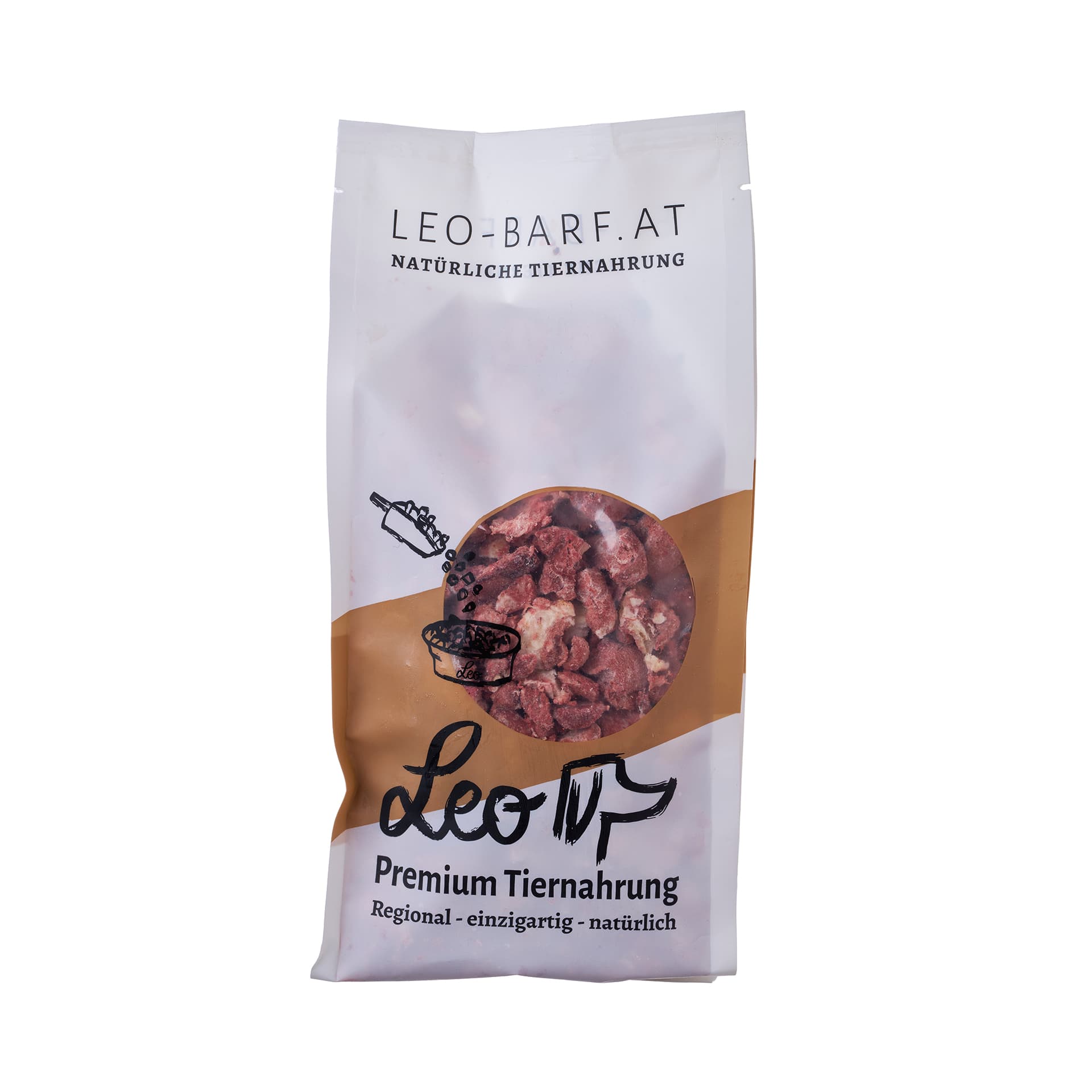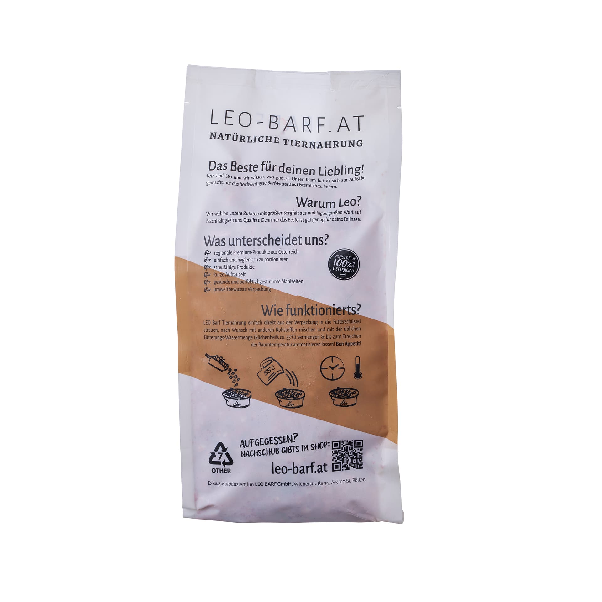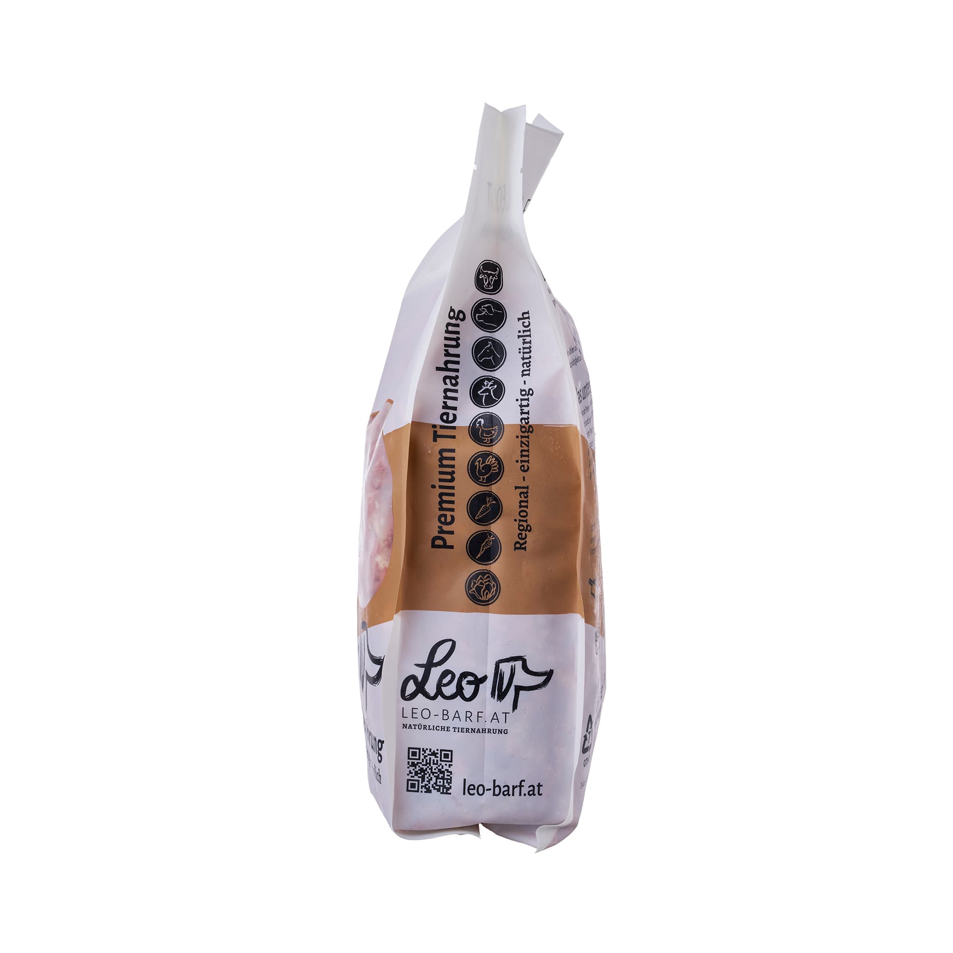 LEO Barf Tiernahrung direkt aus der Verpackung in den Napf geben.