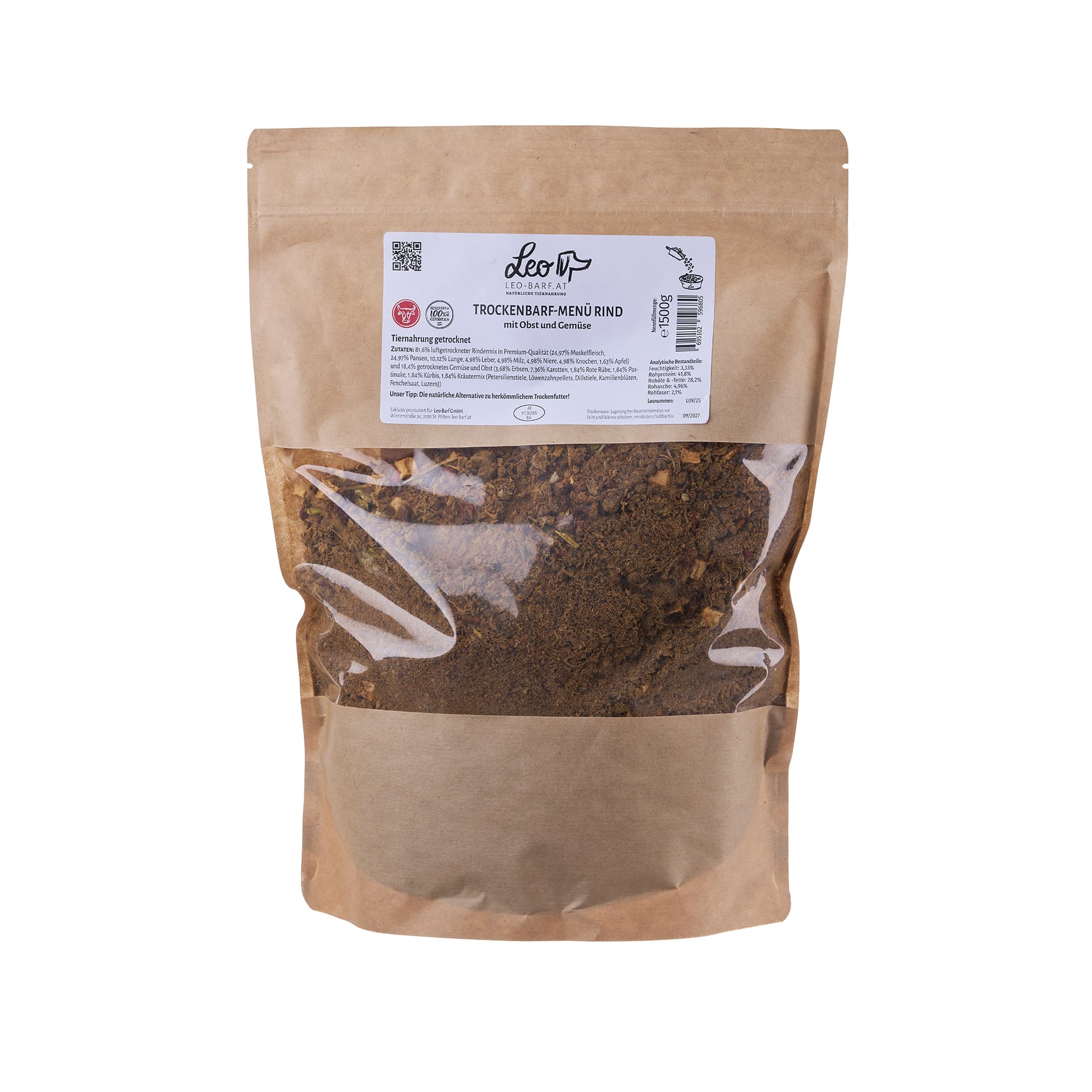 Natürliches Trockenbarf Rind mit Gemüse und Obst aus Österreich. Luftgetrocknetes Rindfleisch, Innereien, kalziumreiche Knochen, Apfel, Gemüse und Kräuter – ganz ohne künstliche Zusätze. Für Hunde aller Rassen und Altersklassen, leicht zu lagern und ideal für Reisen. Ergänzbar mit unserem Mineralmix und hochwertigen Ölen für eine rundum ausgewogene Ernährung.